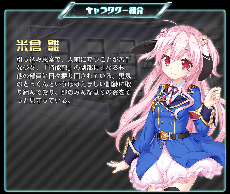引っ込み思案で、人前に立つことが苦手な少女。「特能部」の副部長となるも、他の部員に日々振り回されている。 勇気とっくんというほほえましい訓練に取り組んでおり、部のみんなはその姿をそっと見守っている。
